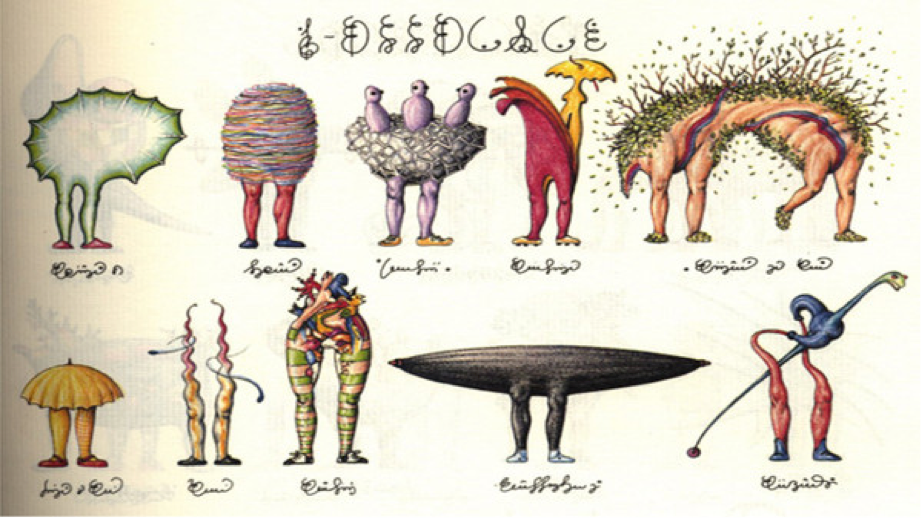 It shares many similarities with the Voynich Manuscript, save its relatively recent vintage and living author: both the Seraphinianus and the Voynich seem to be compendiums of an otherworldly natural science and art, and both are written in a wholly invented language.