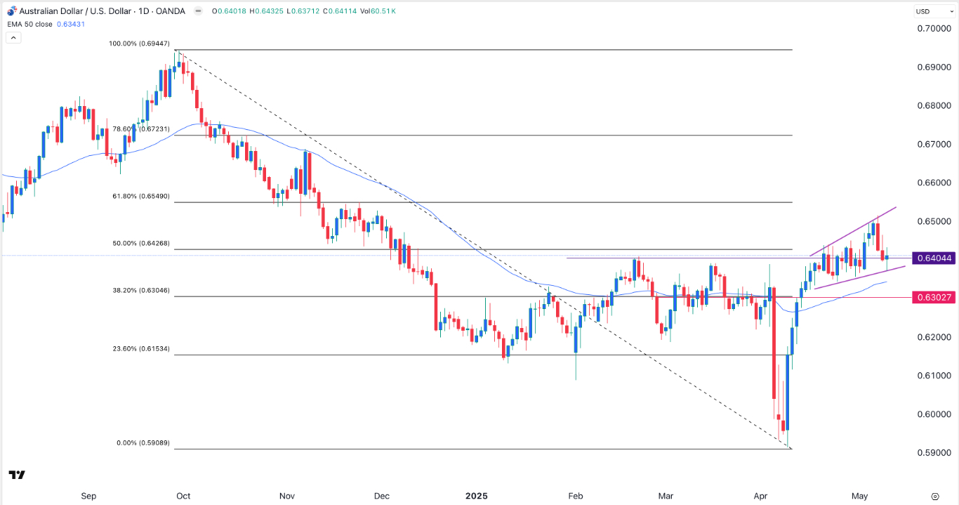The daily chart shows that the AUD/USD pair pulled back last week and briefly moved below the psychological point at 0.6400. It also dropped slightly below the 50% Fibonacci Retracement level at 0.6425.