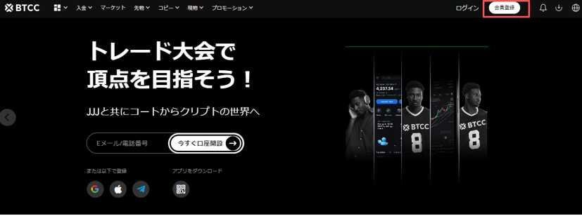 BTCCの公式サイトへアクセスし、「会員登録」ボタンをクリックします。