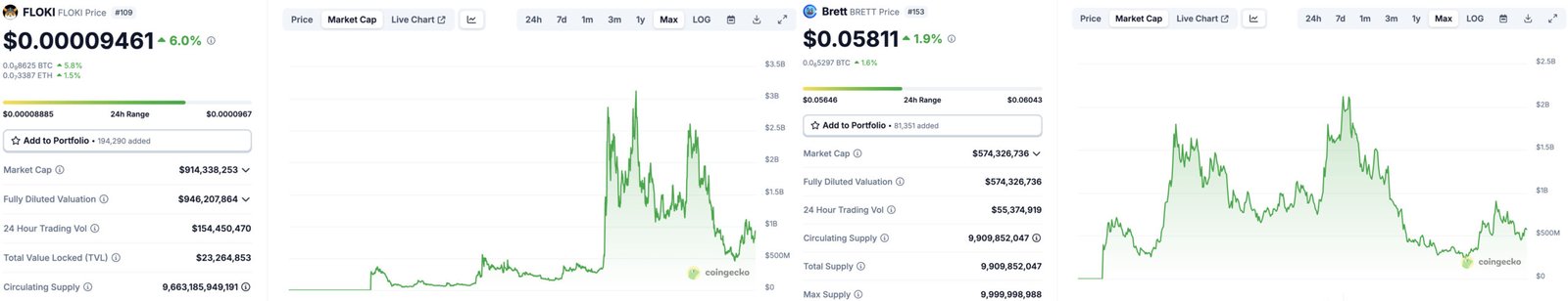 It has been a solid start for Contesoto as DOGE, PEPE, BRETT & FLOKI are all in the green today, posting 4.6%, 2.1%, 1.9% and 6% respectively.