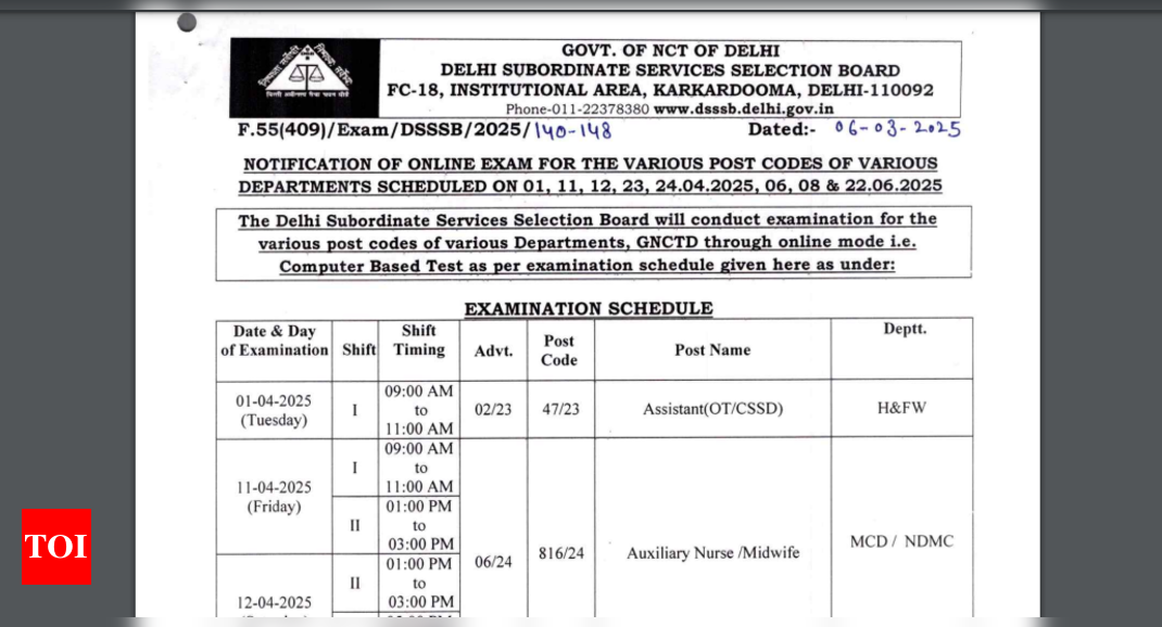 According to the official notice, the DSSSB will conduct exams for various post codes across different departments under GNCTD through Computer-Based Test (CBT) as per the announced schedule. The exams are set to begin on April 1, 2025, from 9 AM to 11 AM, with the timetable extending until June 2025. The board has also outlined exam guidelines for candidates.