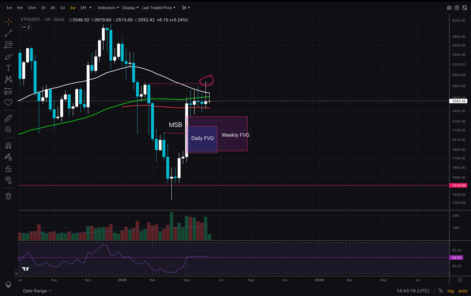 There is also a daily FVG that fits MA100. Will price fill the weekly FVG and front-run the daily? I’d say TA does work for now.