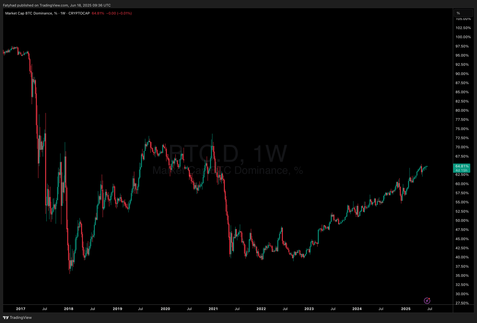 A look at the Bitcoin dominance chart reinforces this narrative. Around 64.8% of Bitcoin’s market share has been climbing steadily since late 2022. In contrast to the 2020–2021 bull run, when BTC dominance peaked at ~73% before rapidly falling and sparking a full-fledged altcoin season, there is no sign of reversal yet.