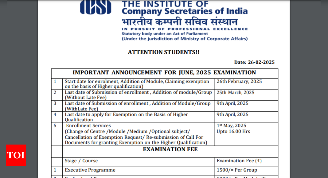 The Institute of Company Secretaries of India (ICSI) will open enrollment for the CS June 2025 exam soon. The official schedule mentions the date of opening of the registration window to be February 26, 2025. Candidates can access the application link on the official website, icsi.edu. The deadline for enrolment and module/group additions without a late fee is March 25, 2025, while applications with a late fee will be accepted until April 9, 2025. Enrollment modifications, including changes in the exam centre, module, medium, optional subjects, and exemption requests, can be made until May 1, 2025.