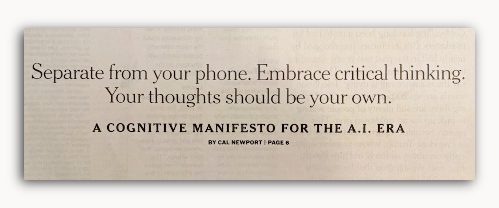 But more important than any specific suggestion is the larger spirit of revolution. “I’m done ceding my brain — the core of all that makes me who I am — to the financial interests of a small number of technology billionaires or the shortsighted conveniences of hyperactive communication styles,” I write in the conclusion of my Times op-ed. “It’s time to move past fretting about our slide into the cognitive shallows and decide to actually do something about it.”