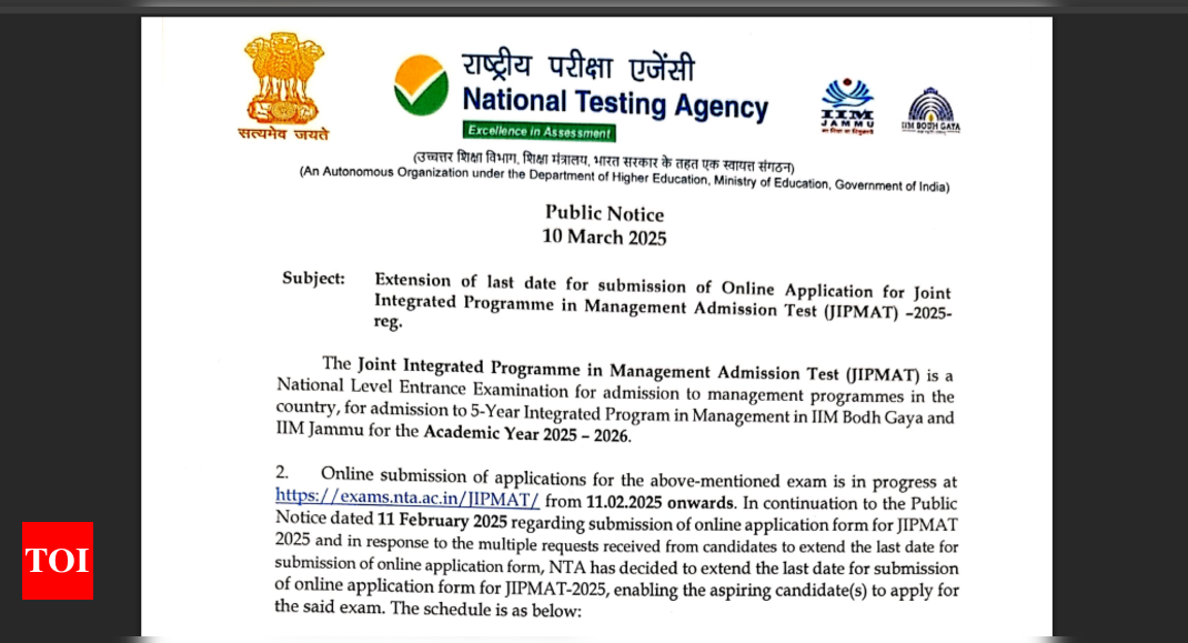 The official notification reads, “Online submission of applications for the above-mentioned exam is in progress at https://exams.nta.ac.in/JIPMAT/ from 11.02.2025 onwards. In continuation to the Public Notice dated 11 February 2025 regarding submission of online application form for JIPMAT 2025 and in response to the multiple requests received from candidates to extend the last date forsubmission of online application form, NTA has decided to extend the last date for submission of online application form for JIPMAT-2025.”