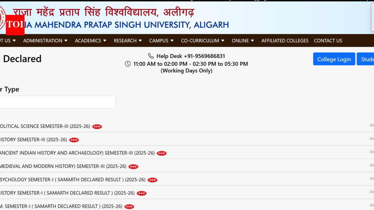Raja Mahendra Pratap Singh University has declared postgraduate semester results for the academic session 2025–26. The results, now available on the university’s official portal, include Semester-III scores for multiple M.A. programmes and Semester-I results under the Samarth system. The notification was uploaded with dates ranging between February 19 and February 21, 2026.