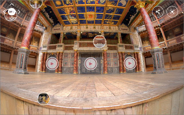Still, the­ater-goers can “get a rich feel for what it was like to be a ‘groundling’ (the stand­ing rab­ble at the front of the stage) in the cir­cu­lar, open-air the­atre.” Short of that, we can tour the Globe in the vir­tu­al recre­ation at the top of the post. Move around in any direc­tion and look up at the sky. As you do, click on the tiny cir­cles to reveal facts such as “Prob­a­bly the first Shake­speare play to be per­formed at the Globe was Julius Cae­sar, in 1599.”
