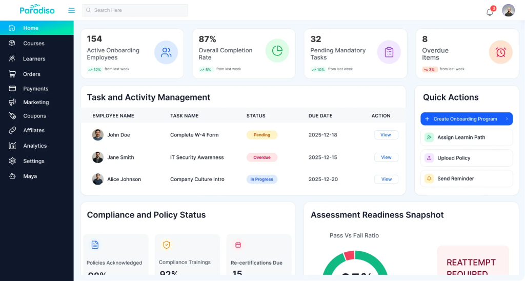- Compliance and certification management with automated assignments, reminders, and audit‑ready reports.