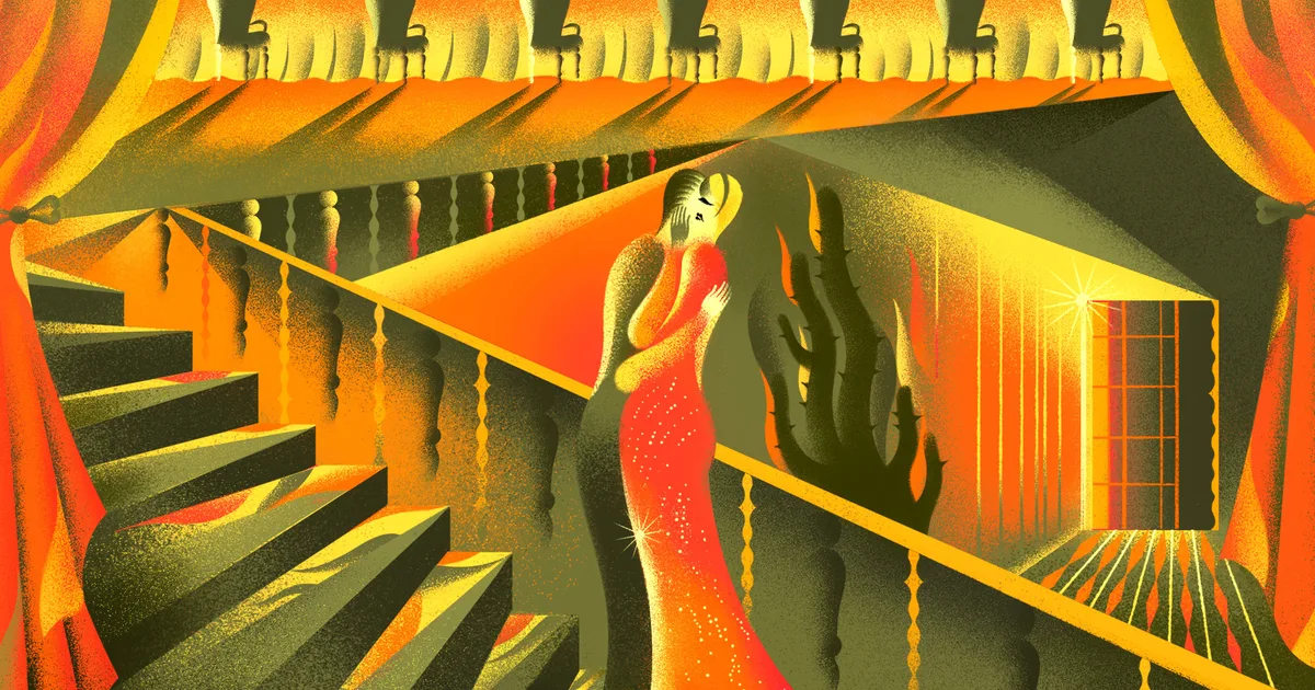 Emma visits San Remo, full of unformed hopes, and ends up shoplifting a book called Atelier Simultane about another Russian émigré to France, the artist Sonia Delauney. This book, with its colour-splashed cover, is a talisman for all that she is about to experience. Cannarozzi’s costumes veer into a new palette, as oranges and reds clothe Emma’s lower half. Undressing is established as a motif.