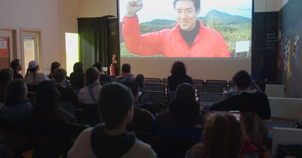 With each hour this makeshift theatre’s atmosphere was calibrated by the ebbs and flows of an ever changing audience. Runners popped in while they caught their breath and attendees dropped by while going about their daily chores. When I arrived at 10pm there were guests who stepped into the space the same way one enters a library, creeping delicately towards vacant chairs, but by midnight the place was humming with a vibrant crowd matching the chaotic energy of Brian De Palma’s Hi Mom! on screen. A fizzing chorus came in fits and starts from the aisles as tinnies and bottles were cracked open, with a backing track of voices as the crowd claimed and relinquished their places.