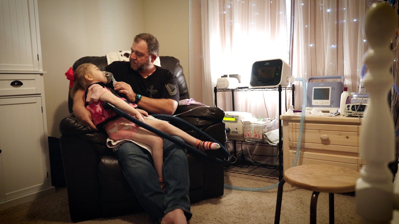 Willow's father helps her use a nebulizer in the film The Zebra and the Bear