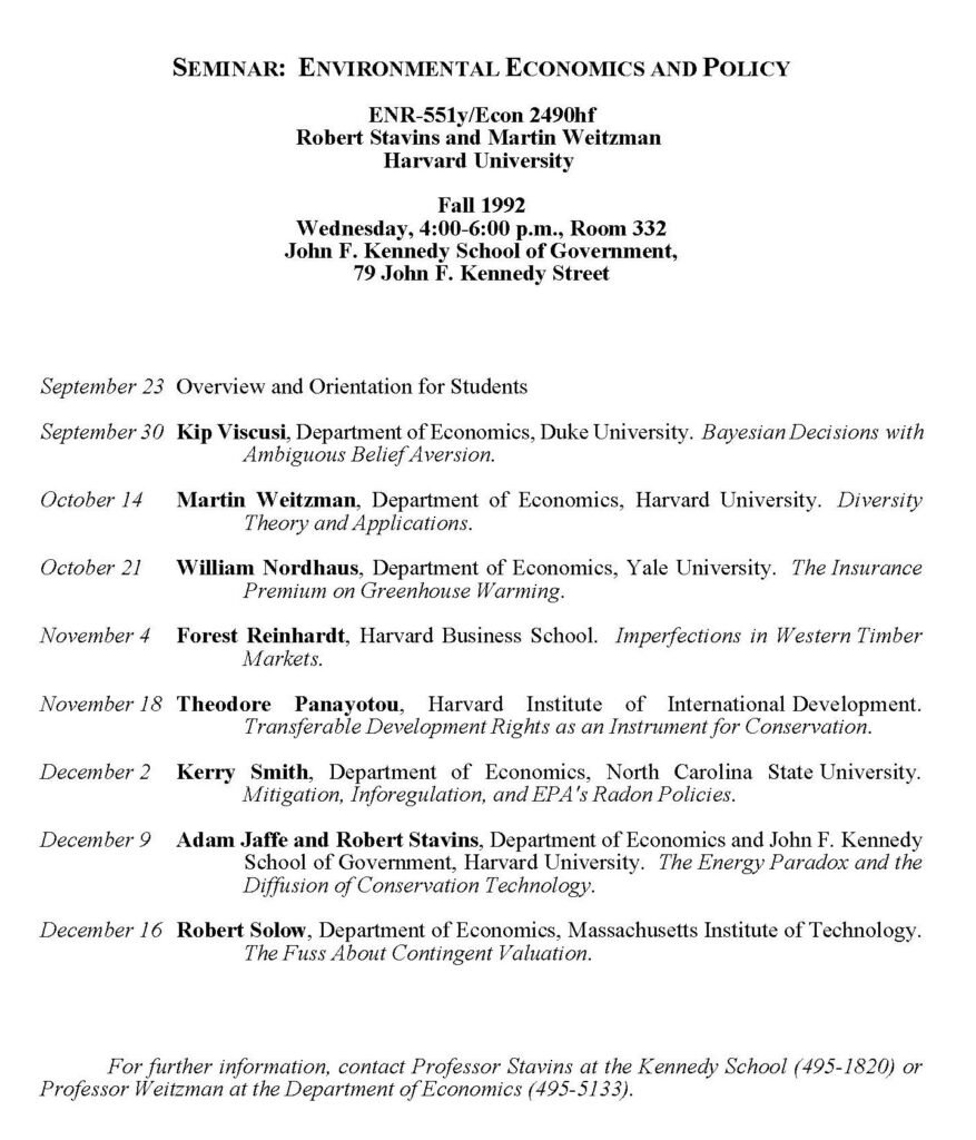 I’ve inserted the schedule below for your reading pleasure. Topics in environmental economics at that time were clearly much broader today, when the profession is focused (albeit not exclusively) on climate change. For some of you, reviewing the schedule below will bring back memories, but I hope for everyone, it will be of interest.