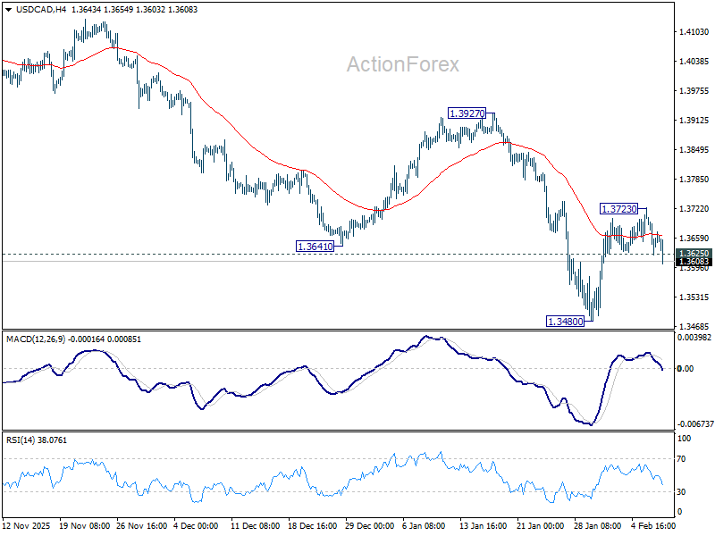 USD/CAD’s break of 1.3625 support suggests that corrective rebound from 1.3480 has completed at 1.3723 already. Intraday bias is back on the downside for retesting 1.3480 first. Firm break there will resume larger down trend from 1.4791 to 61.8% projection of 1.4791 to 1.3538 from 1.4139 at 1.3365.