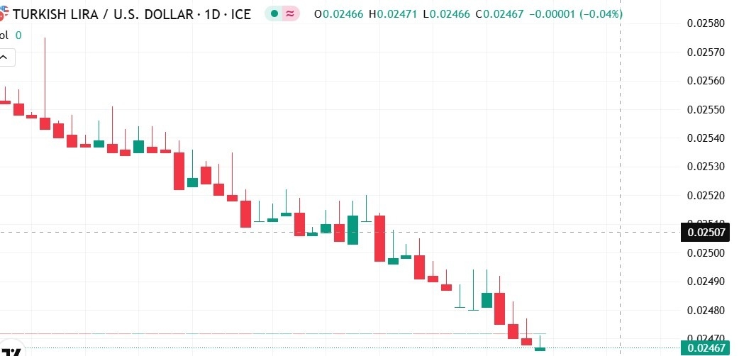 The Turkish Lira (TRY) exchange rate against the US Dollar (USD) recorded a significant decline during today’s trading, reaching 0.0251 against the dollar, after opening at 0.0371. This sharp drop of 0.0121 reflects a 32.48% deterioration in a short period, amidst continued pressure on the local currency. Markets still appear unconvinced by the ability of Turkish monetary policy to curb the decline, with local economic indicators lacking stability.