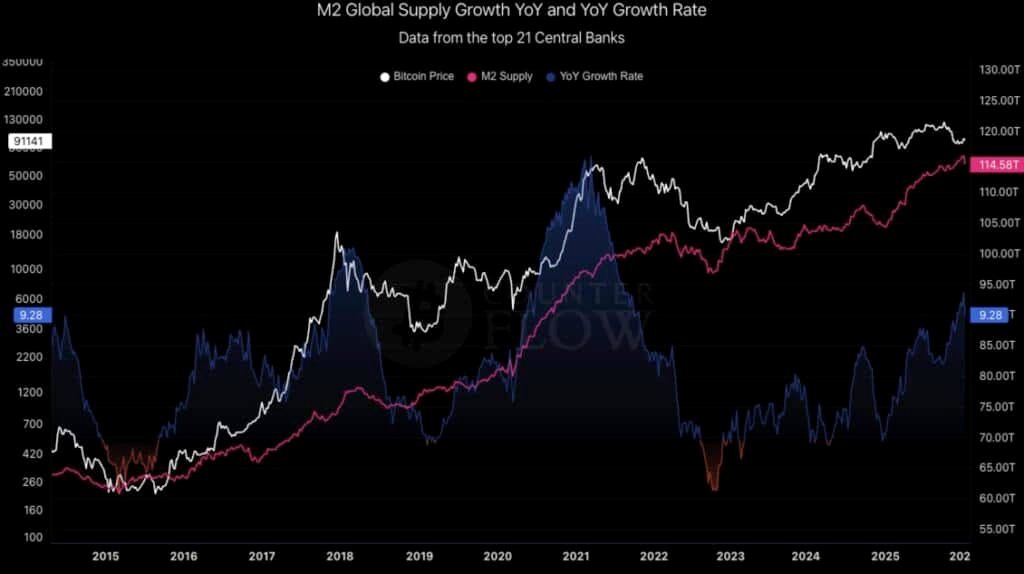 We are currently navigating a complex volatility regime. Global M2 money supply growth has stabilized at approximately +1.0% on a three-month rolling basis, but the “cost of carry” for institutional players remains elevated. The Fed’s current stance, complicated by a criminal investigation into Chair Powell, has introduced a political risk premium into U.S. Treasury yields. We view the current environment as a “liquidity tug-of-war”: expansionary fiscal rhetoric is fighting against a risk-off sentiment triggered by trade war escalations.