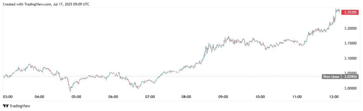 A daily close above this level could open the path to $3.40, followed by $3.60. A more extended bullish scenario points to $4.50, an area associated with historical highs from the 2021 cycle.
